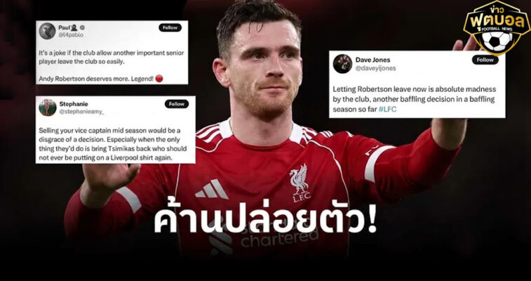 แฟนบอล ลิเวอร์พูล บางคนแสดงความไม่พอใจกับกระแสข่าวที่บอกว่า “หงส์แดง” อาจจะขาย แอนดรูว์ โรเบิร์ตสัน แบ็กซ้ายของทีมให้ ท็อตแน่ม ฮ็อทสเปอร์ ในตลาดการเสริมทัพช่วงเดือนมกราคมนี้